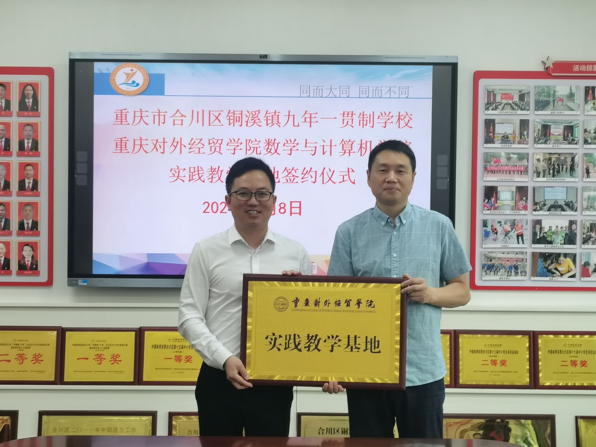 为提升师范生教育教学实践技能,进一步加强大学生校外实践教育基地建设,强化大学生创新意识和实践能力培养,拓宽毕业生就业渠道,构建高校与中学共同参与的实践育人、高质量合作平台,2024年5月8日上午,数学与计算机学院陈东升院长一行前往合川区铜溪镇九年一贯制学校参加实践教学基地签约授牌仪式。重庆市合川区铜溪镇九年一贯制学校党总支书记万清彬,副书记、校长代新华,教学副校长胡月,德育副校长杜江,教务处、德育处、教科处全体成员参加签约暨授牌仪式。