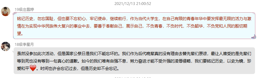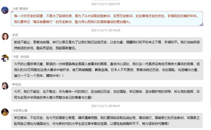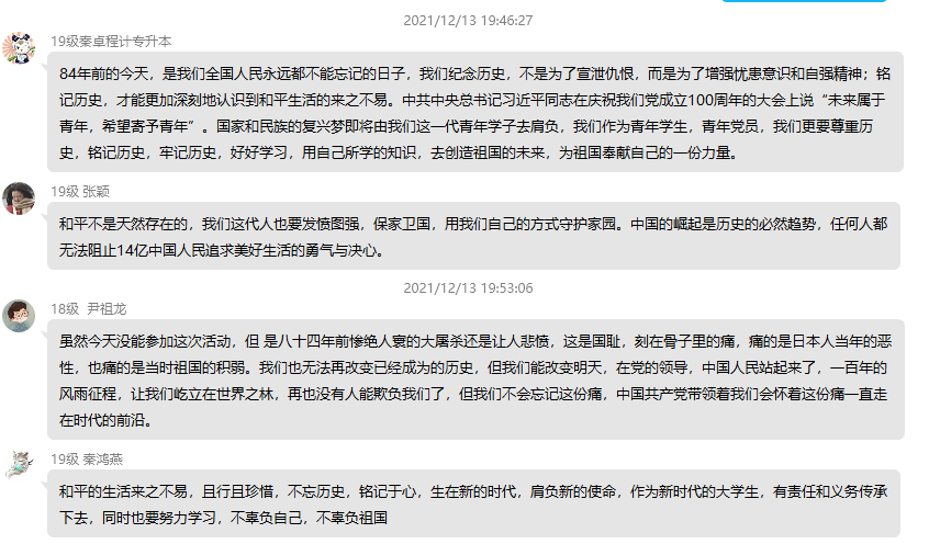 国行公祭,祀我殇胞。数学与计算机学院党总支于2021年12月13日晚上在学院党建活动室举办“国家公祭日”党日活动,悼念南京大屠杀死难者和所有在日本帝国主义侵华战争期间惨遭杀戮的死难同胞,深切缅怀革命先烈的丰功伟绩,弘扬革命先烈的崇高精神。参加本次活动的有数学与计算机学院党总支全体党员。