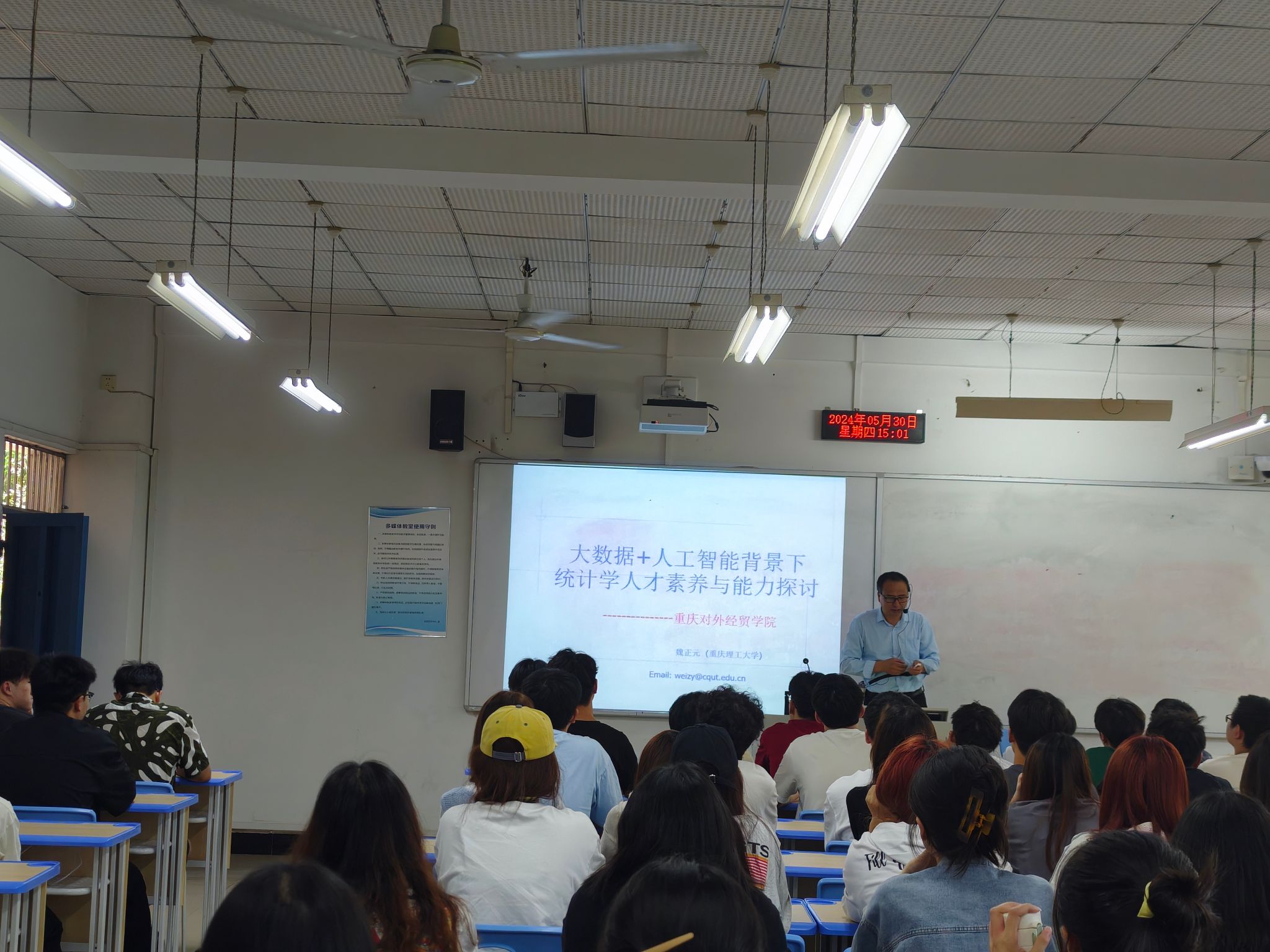 随着大数据和人工智能技术的迅猛发展,统计学作为数据分析和挖掘的基础学科,正面临着前所未有的挑战与机遇。为了引导应用统计学专业的学生适应新时代的发展需求,提升核心素养和专业技能,数学与计算机学院于5月30日在A3212开展了本次学术讲座,参与人员有2022级、2023级应用统计学专业全体学生以及陈光蓉、马小艳等专业老师代表。