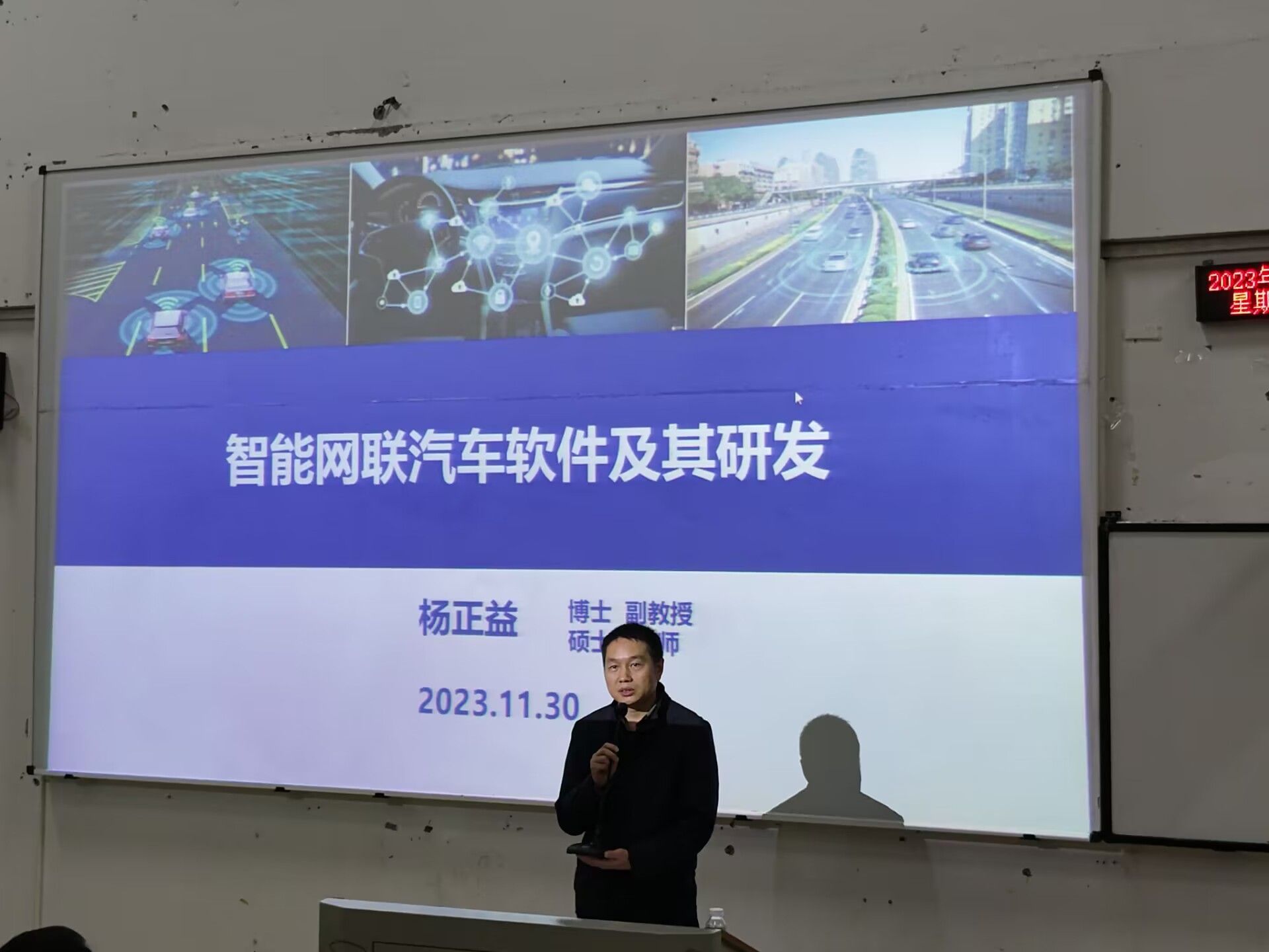 随着AI、大数据、云计算等技术的不断进步,智能软件将变得更加智能化、高效化和自适应,汽车不仅是出行工具,更是智能生态系统的一部分。为更好地了解智能网联汽车软件及其研发的最新动态,提高我院学子对该项技术的认知与了解。数学与计算机学院于2023年11月30日下午,邀请重庆大学大数据与软件学院硕士生导师杨正益到合川A校区A6116教室开展“智能网联汽车软件及其研发”的学术讲座,本次讲座由数学与计算机学院院长陈东升主持。