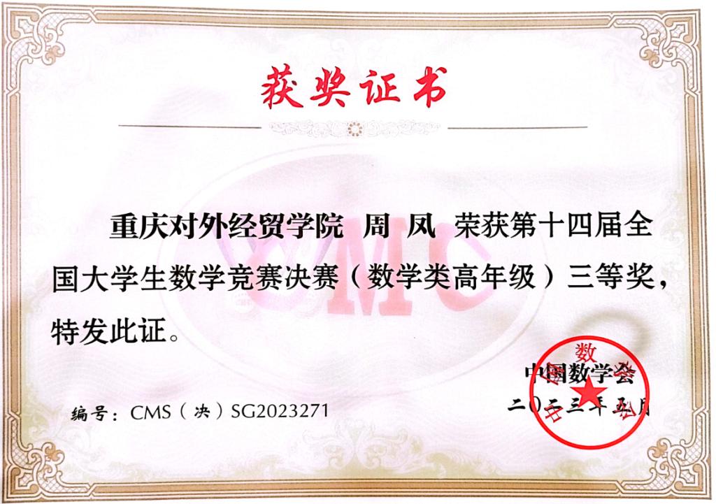 第十四届全国大学生数学竞赛于2023年5月26-28日在广东工业大学成功举行,本届参加赛区32个,高校1024所,初赛参赛人数高达23万,决赛参赛人数922人(数学类461人)。我校在重庆赛区初赛中荣获重庆市一等奖23人(非专业组2人)、二等奖27人(非专业组2人)、三等奖30人(非专业组4人),其中数学与计算机学院周凤同学、石梦欢同学成功入选数学类高年级组决赛,最终周凤同学取得全国三等奖的好成绩。