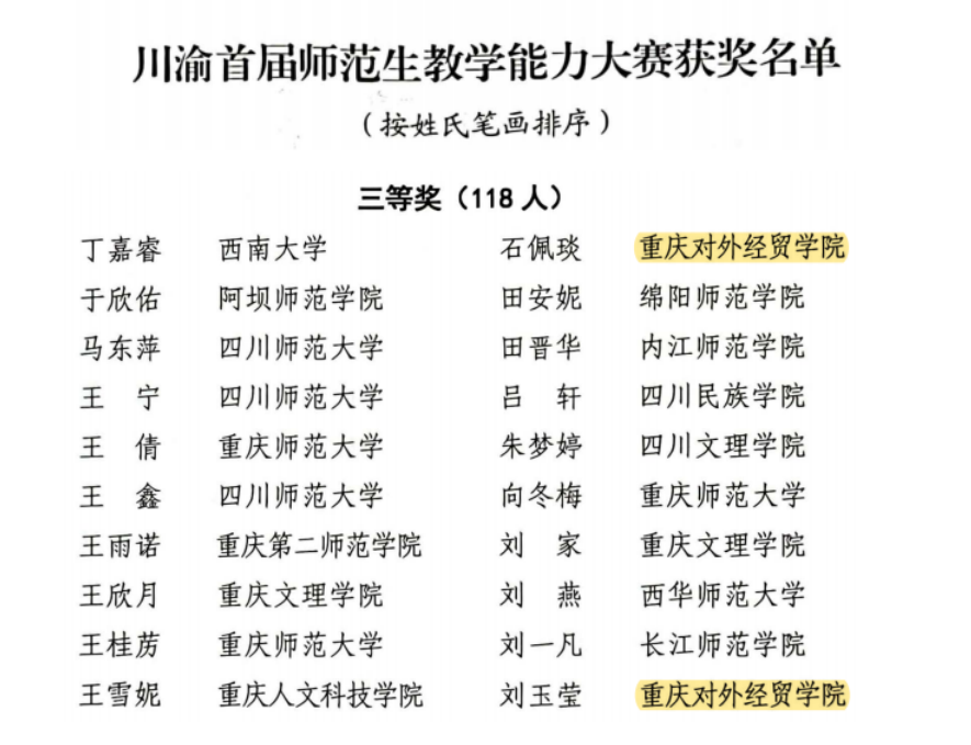 川渝首届师范生教学能力大赛于2022年9月5日至2023年4月9日进行。在学校的高度重视,数学与计算机学院的精心组织下,遴选出石佩琰、刘玉莹两名参赛选手,历经初赛与决赛两个赛程。最终,两名选手荣获川渝首届师范生教学能力大赛三等奖。