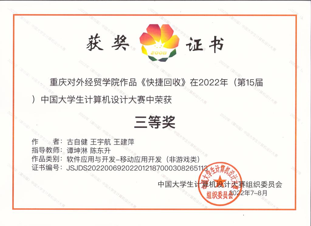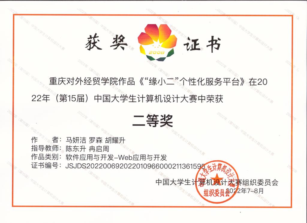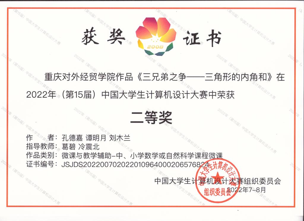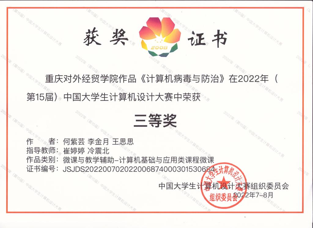 2022年(第15届)中国大学生计算机设计大赛“软件应用与开发”和“微课与教学辅助类”的决赛分别在东北大学、山东大学落下帷幕,我校共有5支队伍参加比赛;最终,2支队伍获得全国二等奖,3支队伍获得全国三等奖。