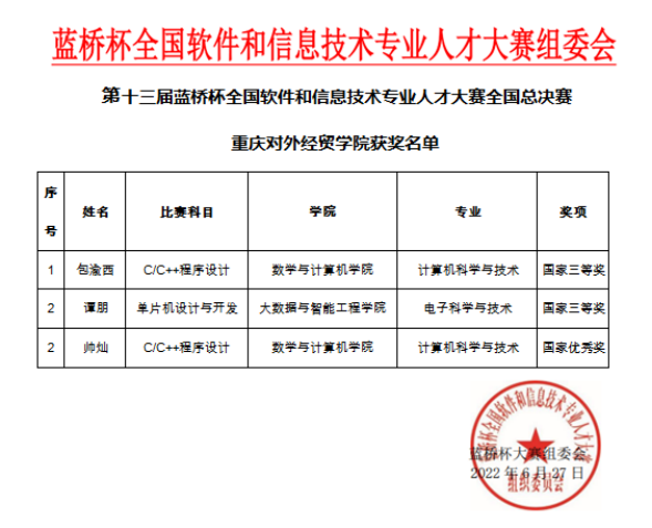 第十三届蓝桥杯全国软件和信息技术专业人才大赛全国总决赛于2022年6月18日开展。本届大赛中,全国共计1064所高校的11061名顶尖选手争夺蓝桥杯全国总决赛桂冠。我校共3名学子参加此次总决赛,获得国家三等奖2人,国家优秀奖1人。